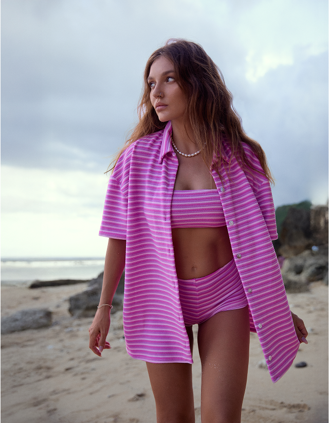 Купальный костюм тройка с шортами, топом и рубашкой — универсальный герой летнего гардероба. Свободная рубашка с коротким рукавом добавляет образу расслабленности и стиля, ее можно накинуть на плечи спасаять от солнечных лучей. Бандо и удобные шорты сидят по фигуре, не стесняя движений. Топ может быть декорирован лямочкой вокруг шеи, что элегантно подчеркивают линию плеч и декольте. Идеален для пляжа, прогулки по набережной или неспешного завтрака в отпуске. Легкий, комфортный и бесконечно актуальный.